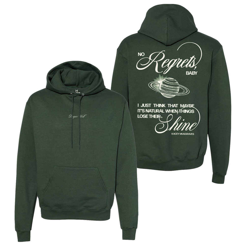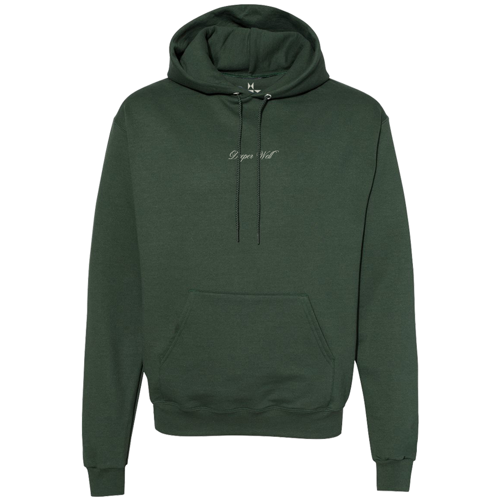 Green hoodie with Deeper Well lyrics printed on the back and Deeper Well on the front